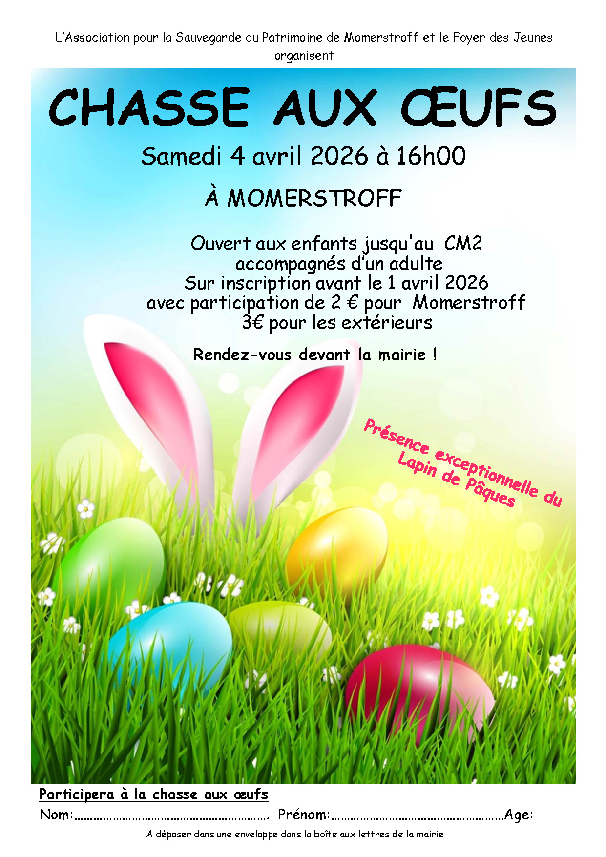 Le véritable Lapin de Pâques donne rendez-vous aux enfants jusqu'au CM2 le samedi 1er avril pour les accompagner pendant la chasse aux oeufs.